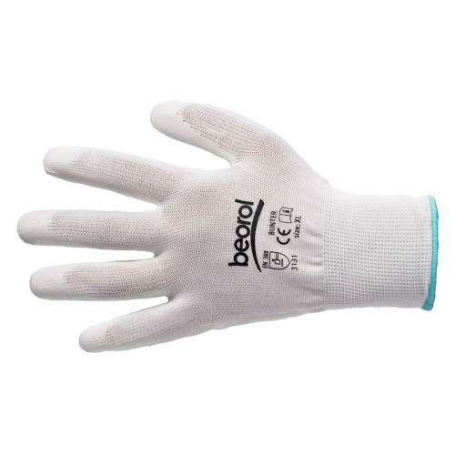 Pletené, bezšvové polyesterové rukavice s tenkou vrstvou polyuretá..
